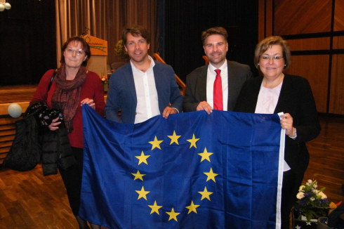 Kerstin Geis (MdL), Thies Puttnins-von Trotha (Bürgermeister von Ginsheim-Gustavsburg), Ingo Kalweit (Bürgermeister von Bischofsheim) und Sabine Bächle-Scholz (MdL).